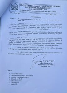 سرگودھا(بیورو رپورٹ)سرگودھا کنٹونمنٹ بورڈ میں کرپشن کے خلاف بڑا اقدام، پلمبر معطل